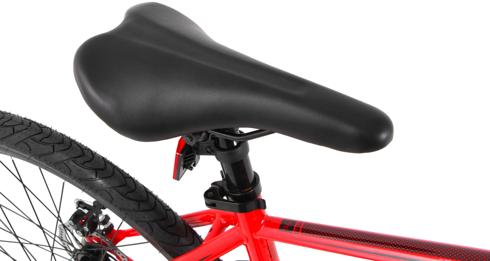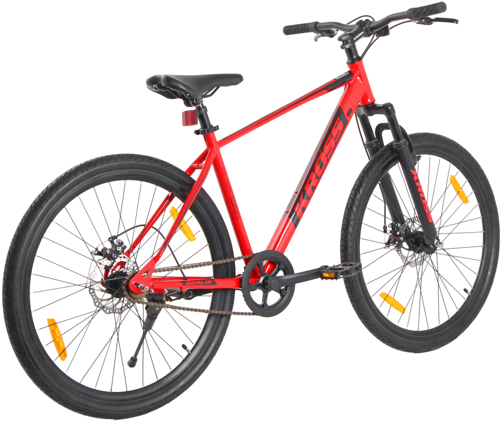 The BERLIN 27.5T Red is a strong and stylish single-speed mountain bike built for daily rides, fitness, and light trails. It features a durable 18” (45.7 cm) MTB steel frame with balanced geometry for a comfortable and confident riding posture. The front suspension fork absorbs road shocks, while front and rear mechanical disc brakes ensure reliable stopping power in all conditions.