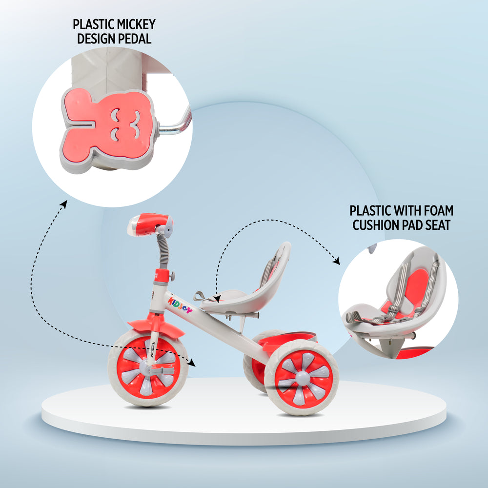 Equipped with front-wheel drive and Mickey-style plastic pedals, this tricycle allows smooth pedaling. The adjustable parental handle lets parents guide and control the ride easily. With 26cm front and 21cm rear EVA wheels, your child can ride with stability on various surfaces. Safety features include a front mudguard, safety belt, front light, musical system, and a rear plastic basket for carrying toys or essentials. Available in Pink/Grey, the TX-1 is perfect for safe and exciting outdoor adventures for toddlers.