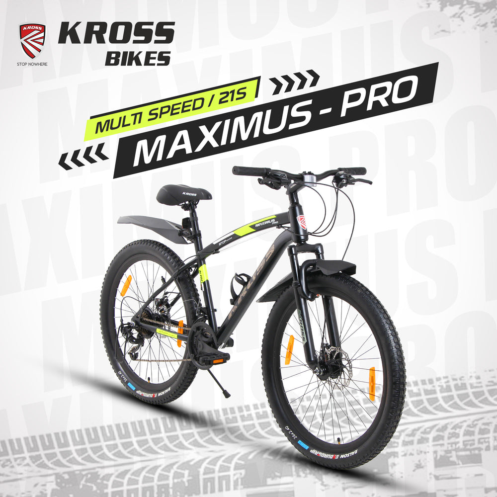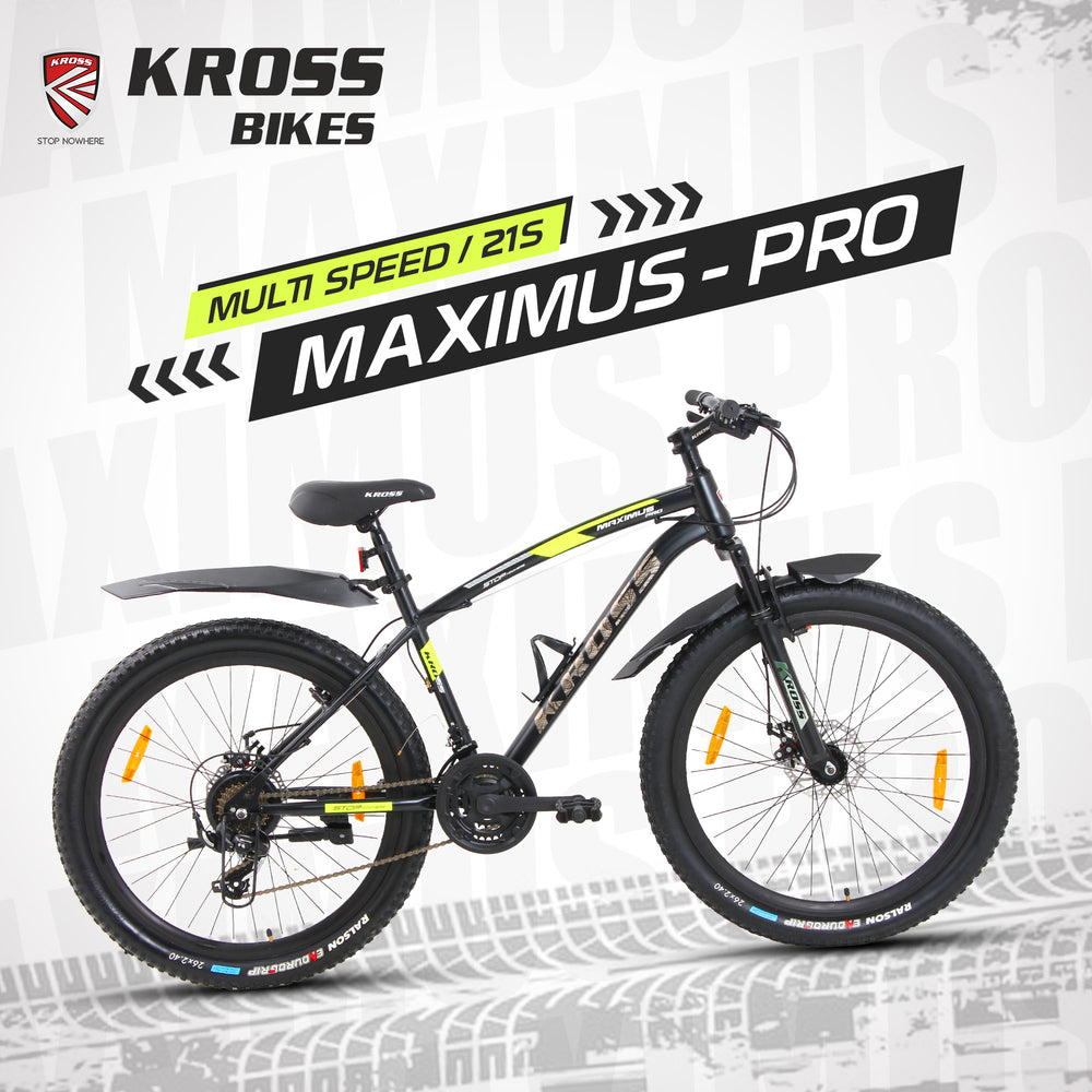 The Kross Maximus Pro 26T (21-Speed) is a performance-ready MTB built for daily rides, fitness, and rough terrain. It features a strong TIG-welded steel frame, responsive suspension fork, and dual mechanical disc brakes for powerful stopping. The wide 26×2.40” tyres offer superior grip and comfort, while the Shimano/L-Twoo Tourney 21-speed drivetrain ensures smooth gear shifting on climbs and flats. Equipped with alloy double-wall rims, comfortable saddle with QR, wide MTB handlebar, and heavy-duty side stand, this bicycle is designed for durability, control, and rider comfort.