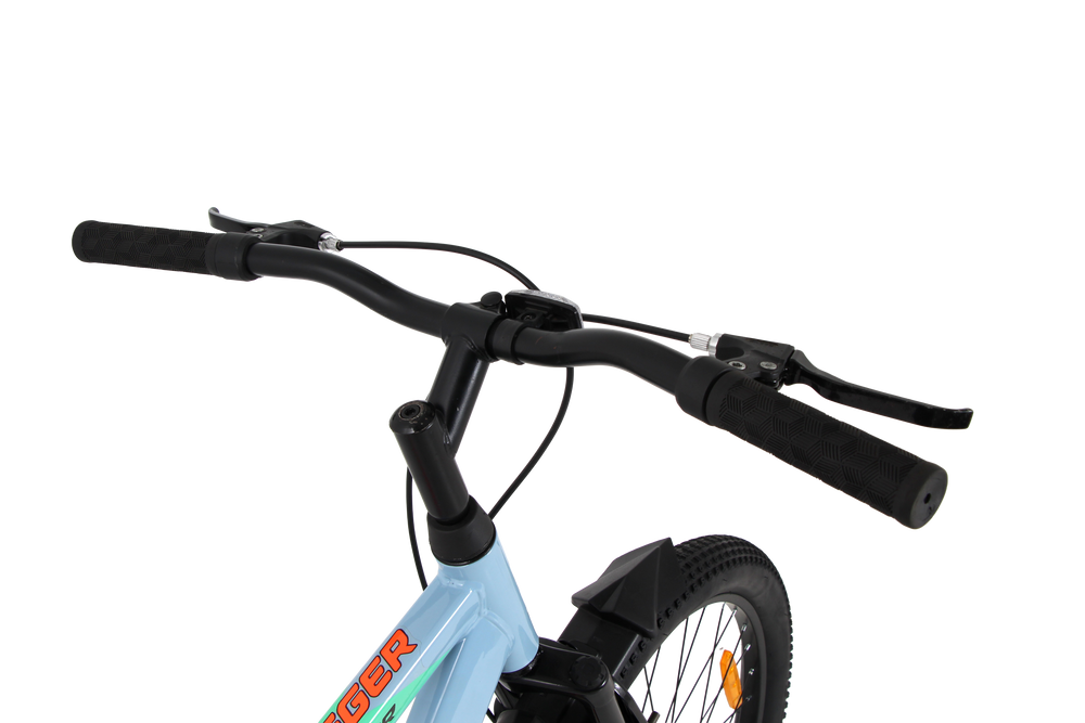 The bike uses dual disc brakes for powerful stopping power and rolls on 26×2.40 Hartex wide tyres mounted on steel rims with 36-spoke hubs, giving enhanced durability and grip.