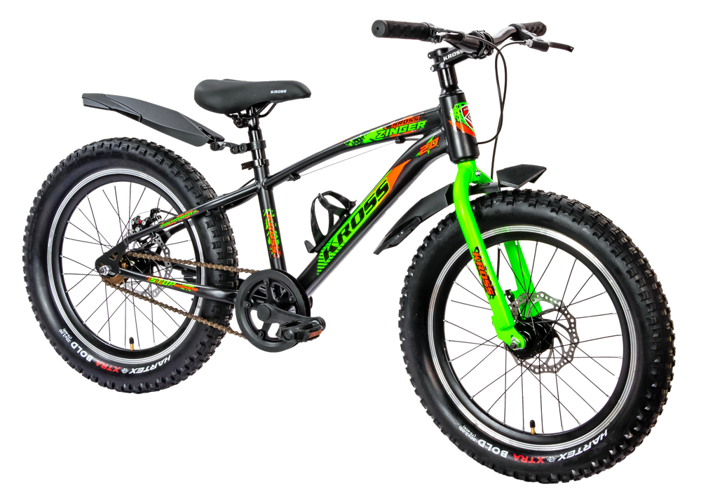 The Kross Zinger 20T SS DD is a robust and stylish kids’ MTB-style bicycle designed for ages 6–10 years. Built with an ergonomically designed steel frame and rigid fork, it offers a stable and safe riding experience. Featuring front and rear disc brakes, oversized MTB handlebar with soft grips, and wide 20x3.0” alloy double-wall rims, it ensures excellent control and comfort. Comes equipped with a comfortable QR saddle, anti-skid resin pedals, flying mudguards, side stand, and bottle cage, making it perfect for fun rides and daily adventures.