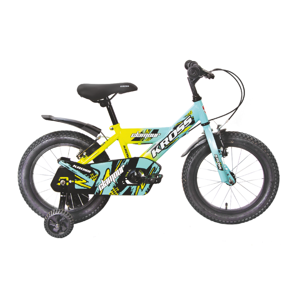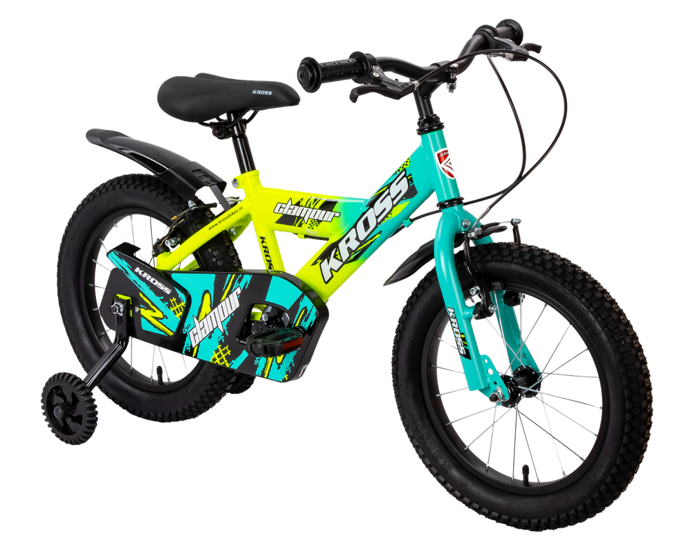 The KROSS Clamour 16T is designed for young riders who love style, comfort, and safety. Built with a strong ergonomically crafted steel frame, wide 16x2.40 tyres, and stable 2-in-1 side supporters, this bike ensures excellent balance and control for kids learning to ride. The matte yellow-blue finish gives it a sporty and energetic look.