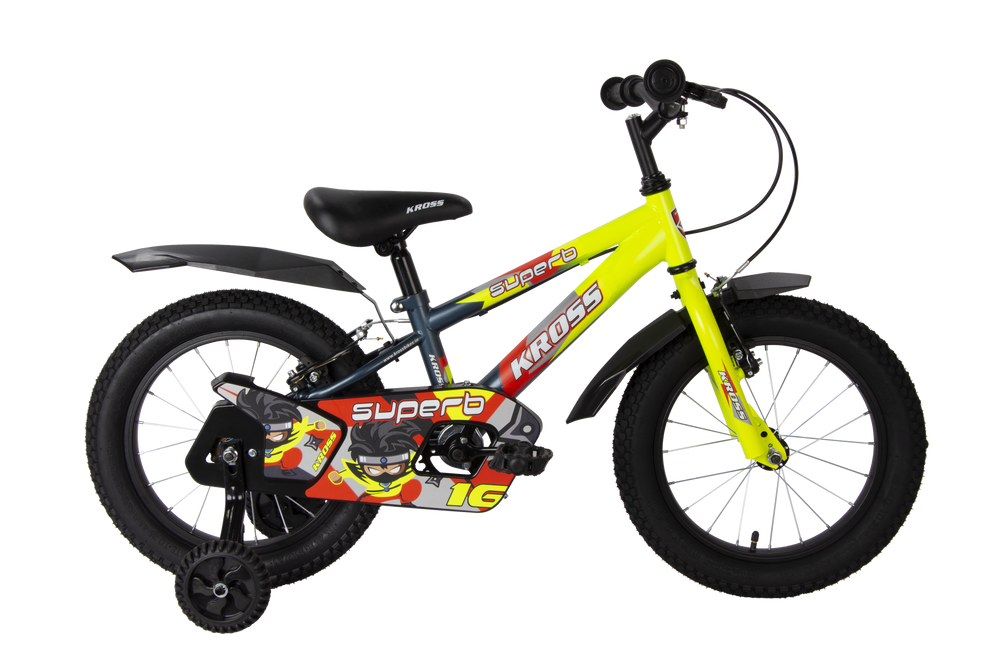 The Kross Superb 16T is designed for young riders who love comfort, control, and a sporty look. Built with a durable steel frame (21.5 cm) and rigid fork, this bicycle ensures smooth rides on every terrain. The double blend raised handlebar with extended stem offers better posture and handling, while front and rear V-brakes provide efficient stopping power. Its comfortable saddle with quick release and alloy rims makes it a perfect mix of style and stability for kids aged 6–9 years.