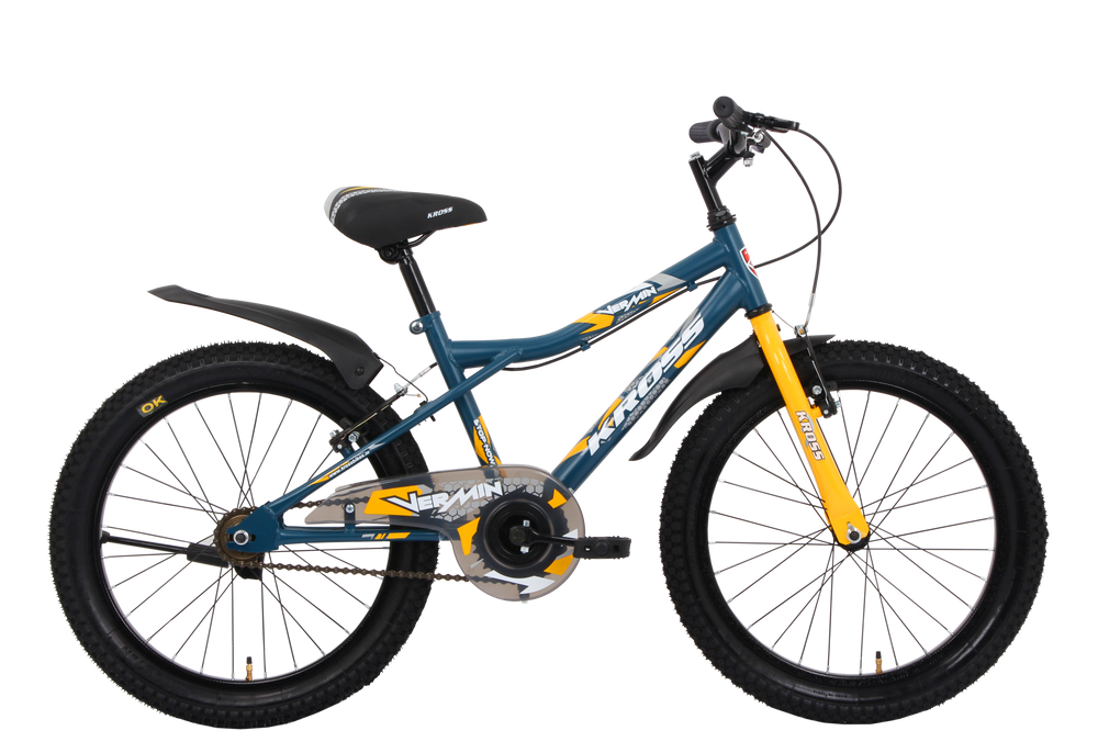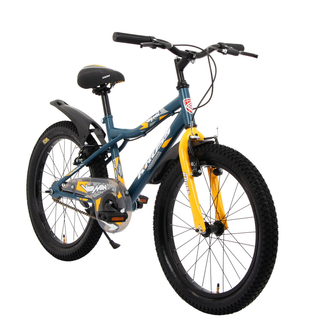 The Kross Vermin 20T is a sturdy and stylish single-speed bicycle designed for young riders who enjoy both comfort and control. Built with a strong ergonomically designed steel frame (32.5 cm) and a rigid fork, this model ensures stable and smooth rides. The bend-type handlebar with extended stem and soft grips provides extra comfort, while the front and rear V-brakes with alloy levers deliver powerful braking performance. With its wide 20 x 2.40 tyres, comfortable saddle, and essential accessories like mudguards and a side stand, the Vermin is perfect for everyday adventures.