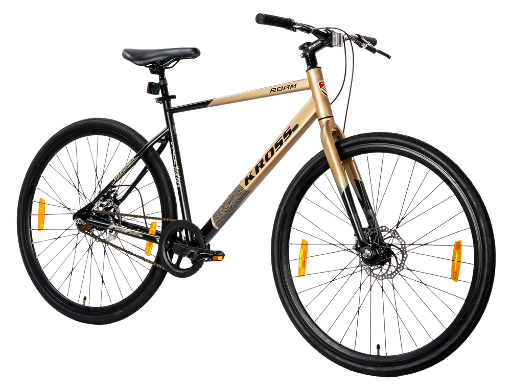 The ROAM 700C SS DD is designed for smooth and efficient urban commuting. Built with a strong 49.5 cm (19.5") TIG-welded steel frame featuring shaped tubes, water decals, and internal cable routing, it delivers durability with a premium look. The rigid steel fork, oversized MTB handlebar, mechanical disc brakes, 700C alloy double-wall rims, and comfortable QR-adjust saddle make this cycle perfect for daily rides, fitness sessions, and long city routes. Its single-speed drivetrain ensures low maintenance and consistent performance.