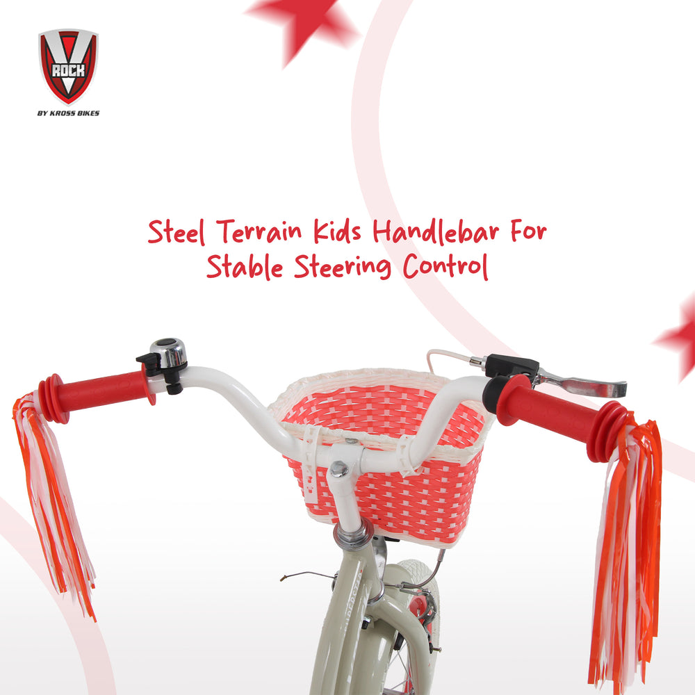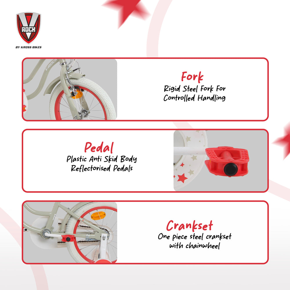 Its 16-inch strong steel wheels and wide tyres provide excellent grip and durability on various surfaces. Finished in an attractive cream color with vibrant accents, this bicycle is perfect for fun outdoor adventures.